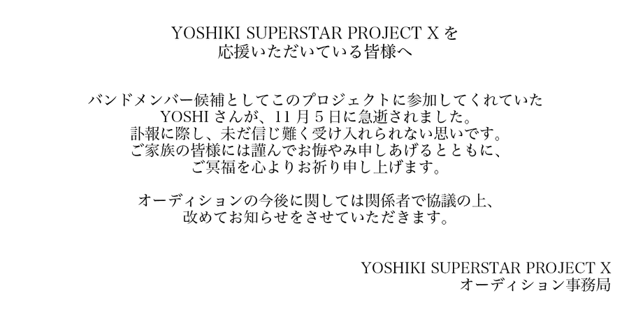 11月6日YOSHI的经纪公司发布了讣告,报告了YOSHI已经于11月5日在医院离世的消息,并对大家的关心表示感谢。