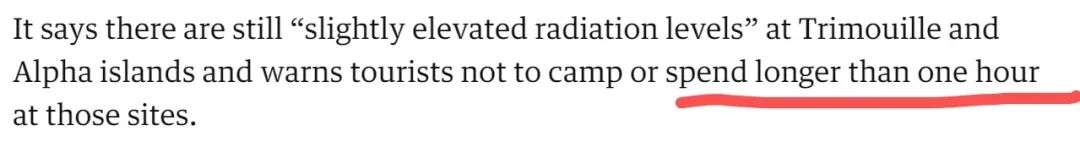 由于辐射升高,游客被建议一天仅逗留一小时,并避免扰乱附近土壤和沉积物等。