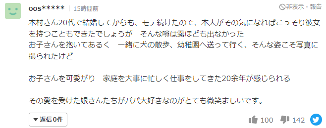 「木村20多岁结婚以来,一直都备受欢迎,可能他本人也意识到这一点,所以从来没有隐育过,抱着孩子走路、一起遛狗、送孩子去幼儿园等等,媒体也拍到了很多这样的照片。爱孩子、珍惜家庭勤勤恳恳工作,不知不觉已经20多年了,看着他们父女相亲相爱的照片不自觉地被感染到!」
