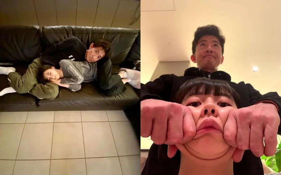 还配上了一张父女俩平躺在沙发上的搞笑照片
