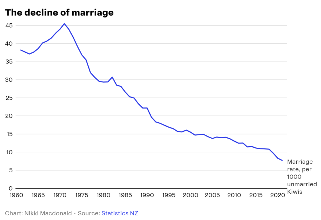 从新西兰统计局的结婚人口比例变化图上可以看到,结婚者的百分比从1970年代开始,不断下滑。