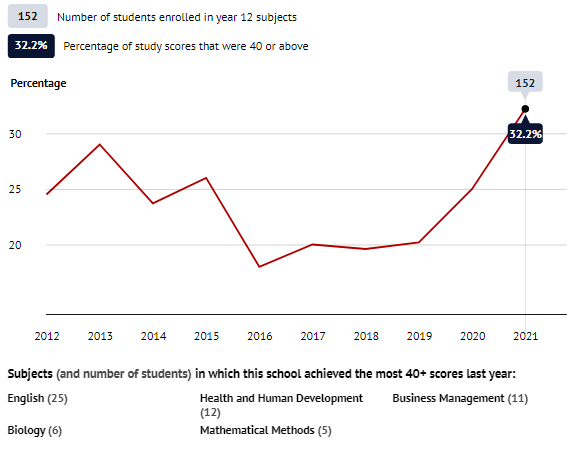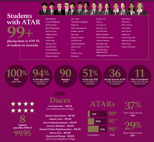 学校成功地结合了良好教育所需要的几个组成部分:高质量的教学价值观、性格和态度的培养以及挑战性的辅助课程活动。多年以来,该校的学术成绩都位于澳大利亚维多利亚州男女混校前十位!