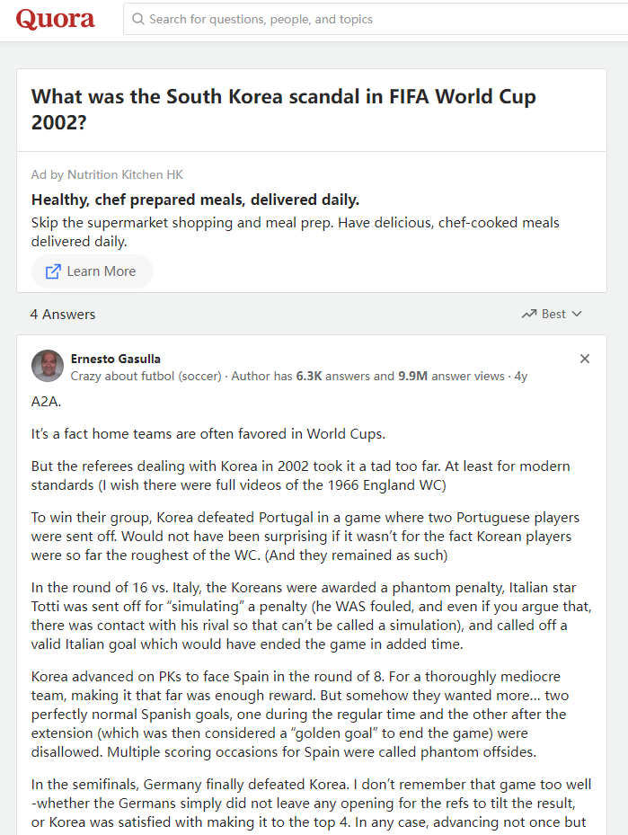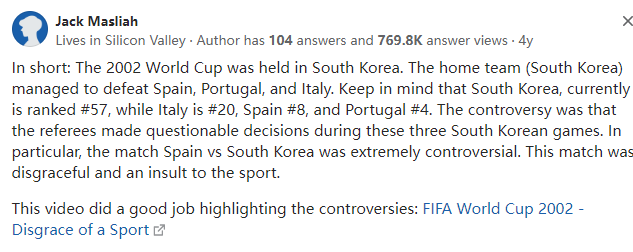 公平起见,让我们看看Google中关于“2002年国际足联世界杯韩国队丑闻是什么”相关提问下外国球迷的回答。