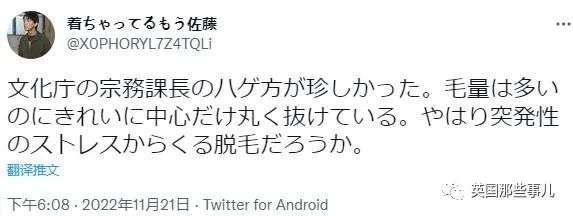 “文化厅宗务课课长的秃头样子挺罕见。明明发量挺多的,唯独中间光秃秃的,是因为突发性的压力导致脱发的嘛?”