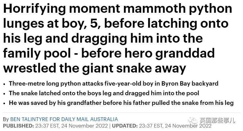 蟒蛇突然蹿出来咬住他的脚踝,用整个身体缠住他的腿,蟒蛇身长相当于男孩的三倍,不费什么力就把男孩拖入游泳池里。