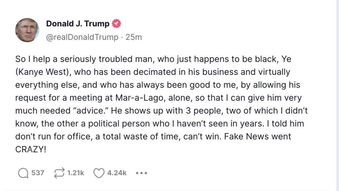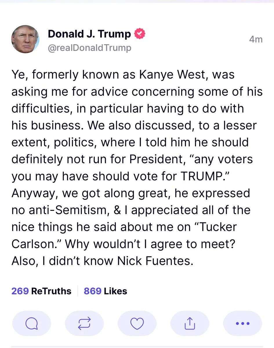 一向见惯了大场面的特朗普,这次也有点点慌。他在Truth上中承认这次晚宴,但是,赶紧与富恩特斯撇清关系:“上周,坎耶·维斯特给我打电话说在海湖庄园吃晚饭。不久之后,他出人意料地带着三个我不认识的朋友出现了。我们在星期二晚上与许多成员在后院共进晚餐。晚餐很快,很平静。然后他们就出发去机场了。”