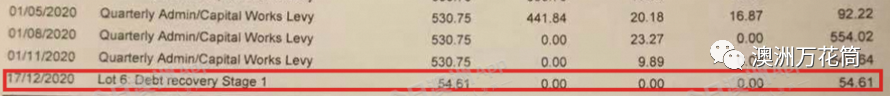 直到来年2月返回澳洲,才补缴上年所欠的两期物业费,共计约$1000澳元,并支付了10%的逾期利息。