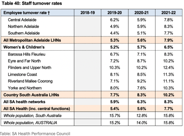 委员会还审查了南澳卫生部门的员工队伍,发现在过去三年里员工流失率有所增加。2021-22年的流失率“令人担忧”,从2019-20年度的1/13工作人员离职上升到2022-22年度的1/10辞职。