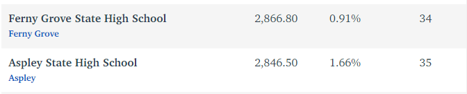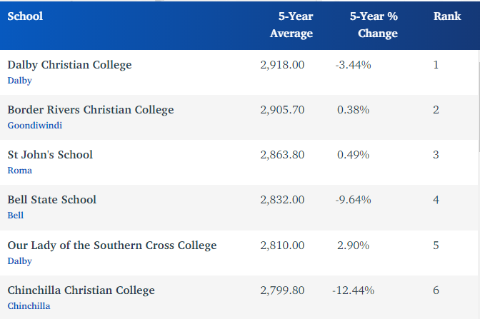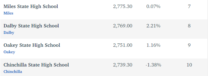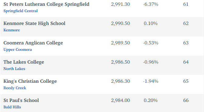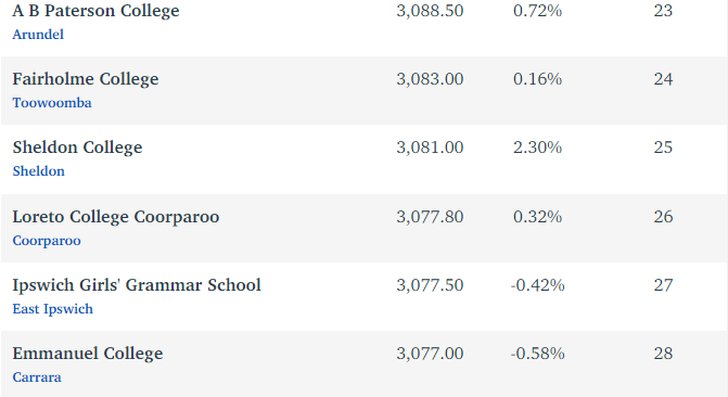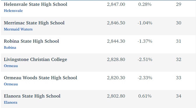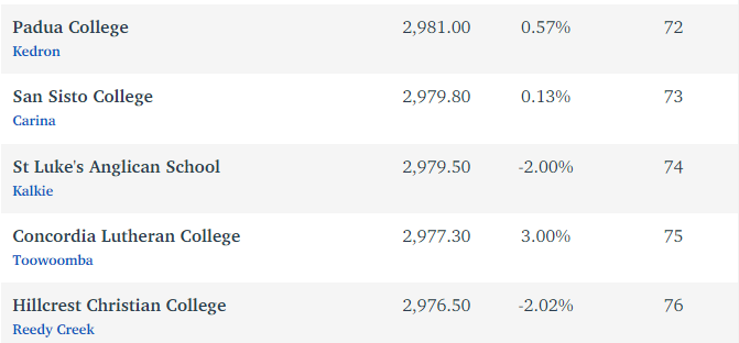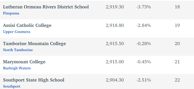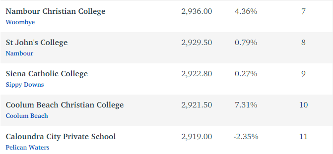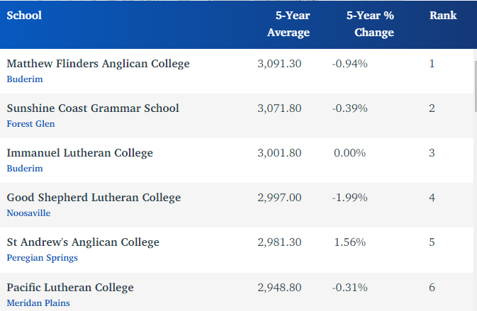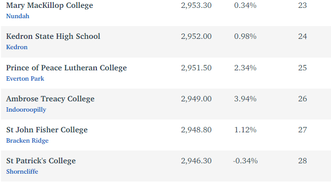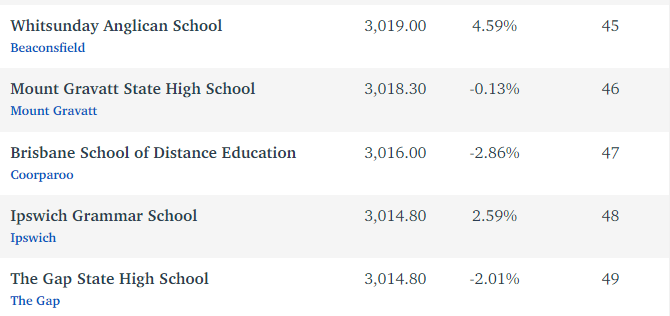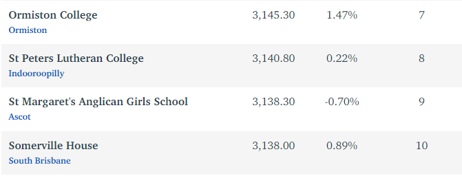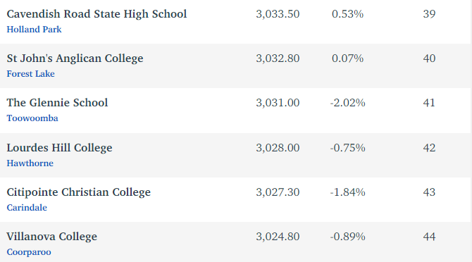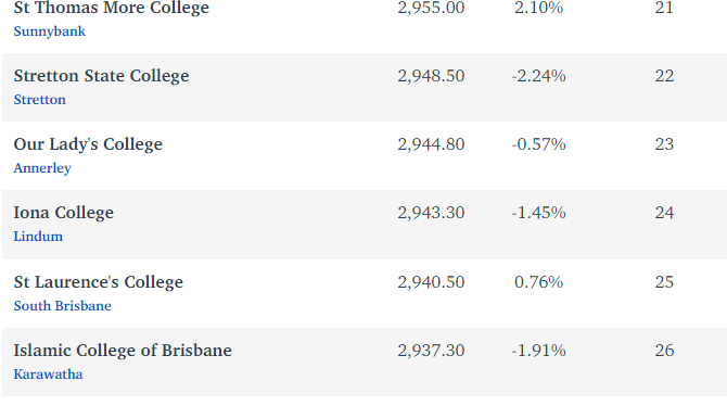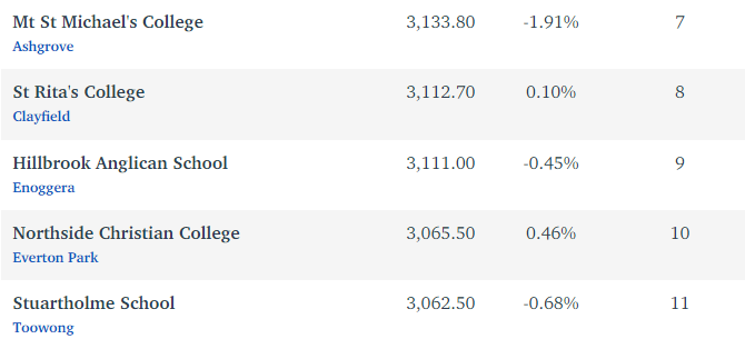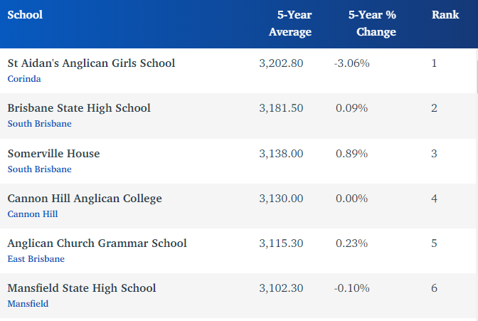 该地区表现最好的中学,是位于Corinda的著名女校St Aidan’s Anglican Girls School,以5年来的平均得分3202.8排名第一。