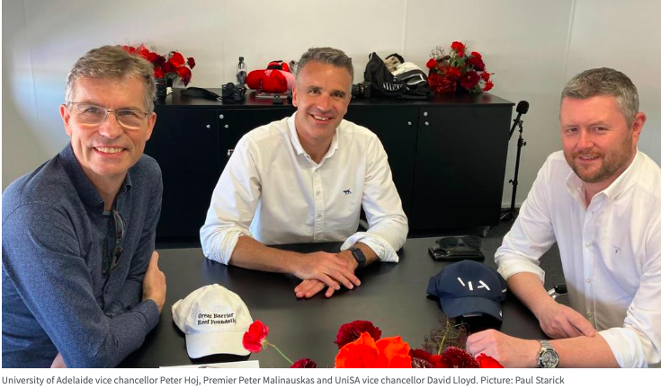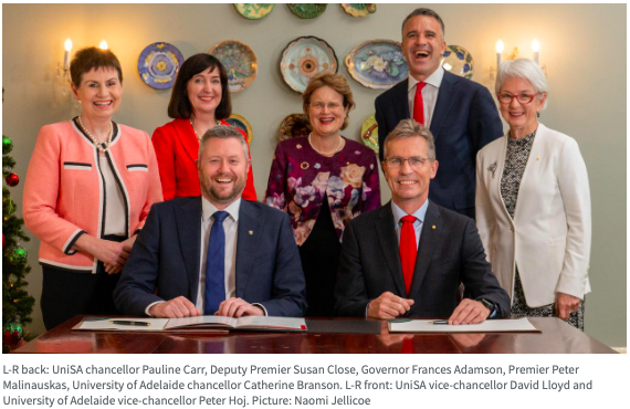 周三晚上,南澳州长Peter Malinauskas和两所大学的官员签署了一份合作声明,被誉为“历史性的协议”,旨在“创建一所未来的大学”。