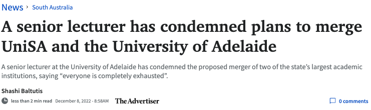 阿德莱德大学的一名高级讲师谴责了两校拟议中的合并。