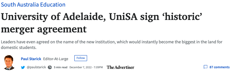 “我很高兴地说,南澳大学和阿德莱德大学再次回到合并谈判,这还不是板上钉钉的事,但有可能形成一所可以与东部各州媲美的伟大大学。”