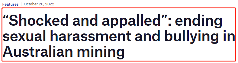 有今年10月份出炉的调查报告指出,澳大利亚74%女性矿业从业者,在过去五年里遭遇过性骚扰。澳洲业界也不断发出呼声,希望杜绝职场霸凌和性骚扰。