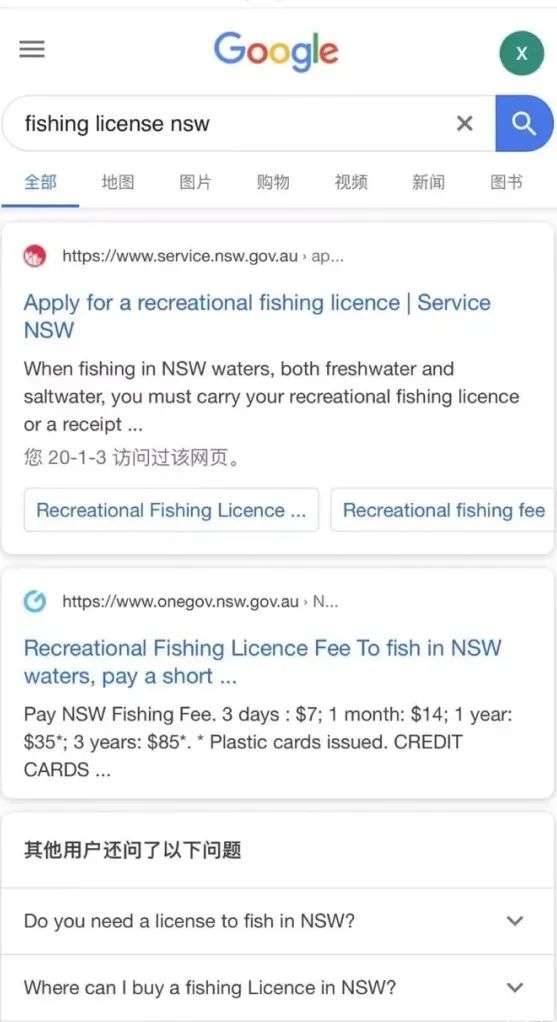 Google搜索fishing license NSW