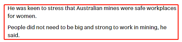但正如她所提到,目前澳洲矿场的职场环境对女性而言已经有很大的改善,女性从业者人数逐渐变多,矿业巨头们也急切地希望提高女性在员工中的比例。