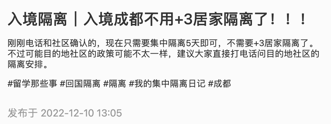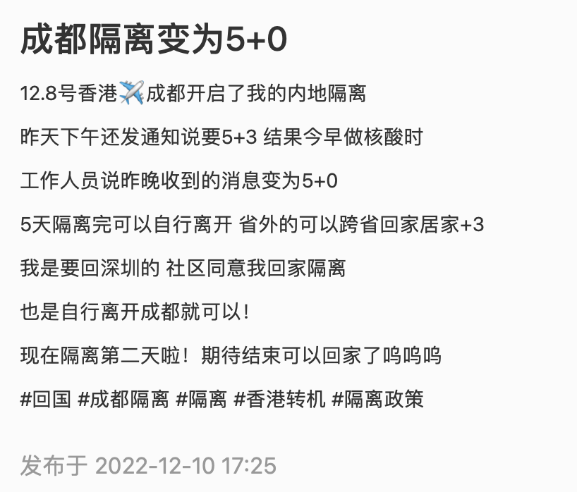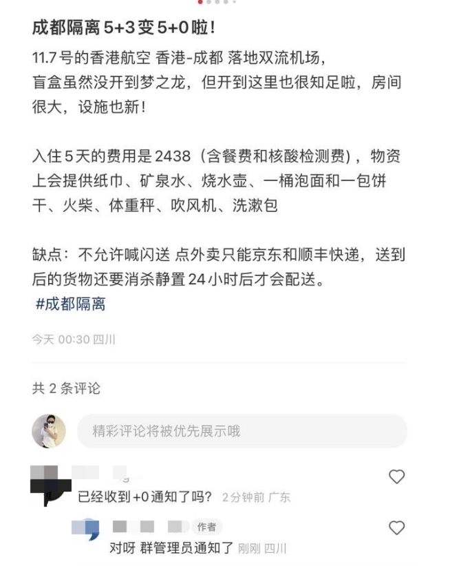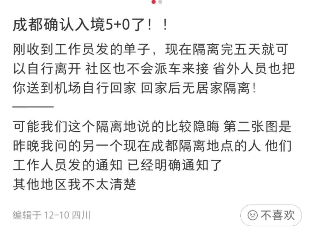 已有多名网友在小红书上发帖透露,成都入境从“5+3”变成了“5+0”!