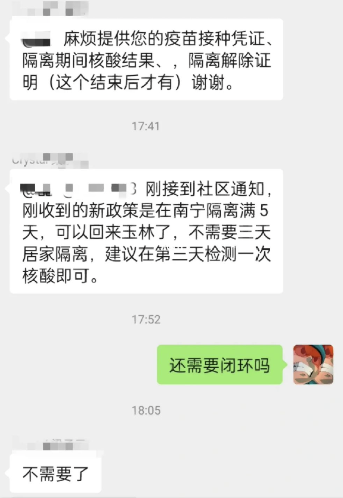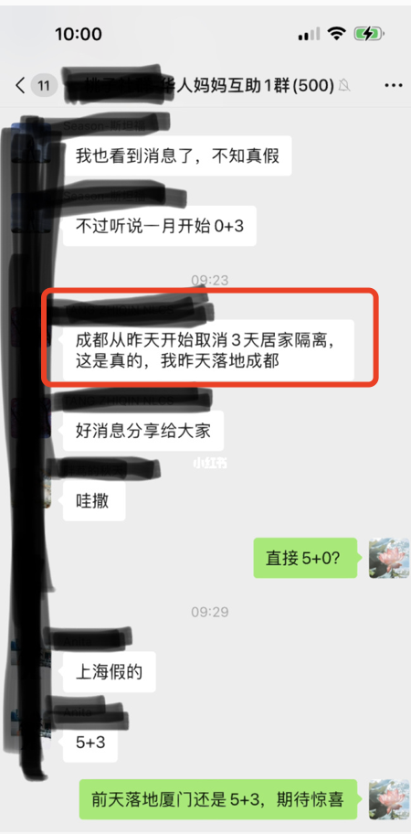 还有网友在小红书发出了疑似社区的聊天记录,有人称9号落地成都已经被告知不需要再+3,取消居家隔离,只要集中隔离5天。