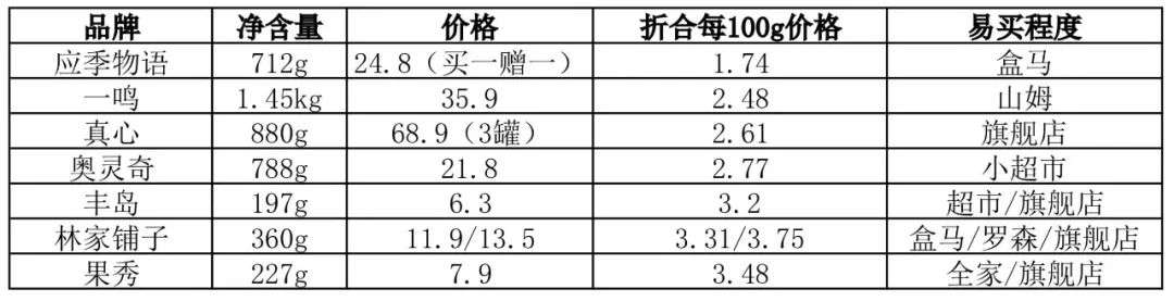 一鸣、应季物语、丰岛、果秀、林家铺子、真心、奥灵奇。(排名顺序按配料表干净程度排列)