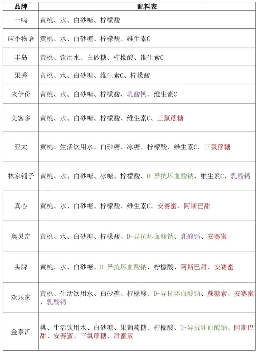 单这也不是绝对的,比如我们测评的黄桃罐头里,偶尔也有见到添加D-异抗坏血酸钠抗氧化剂的,在下文的测评中,这种我们会标明。