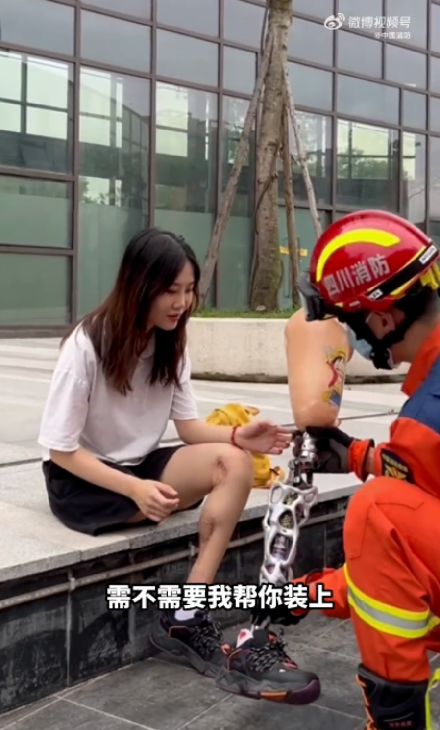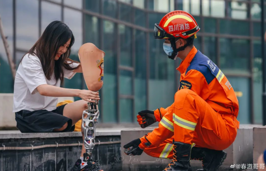 两个人第一次见面,源于一次求助。女孩的假肢卡在了石阶里。消防员迅速赶到现场,取出了她的腿,还问她要不要帮忙安上。