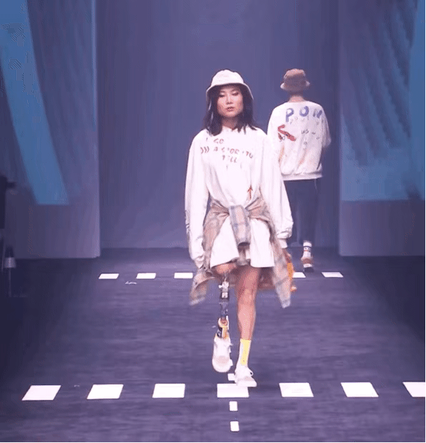 2021年10月,她踩着一条小钢腿在上海时装周T台上亮相,迎来观众的喝彩声。