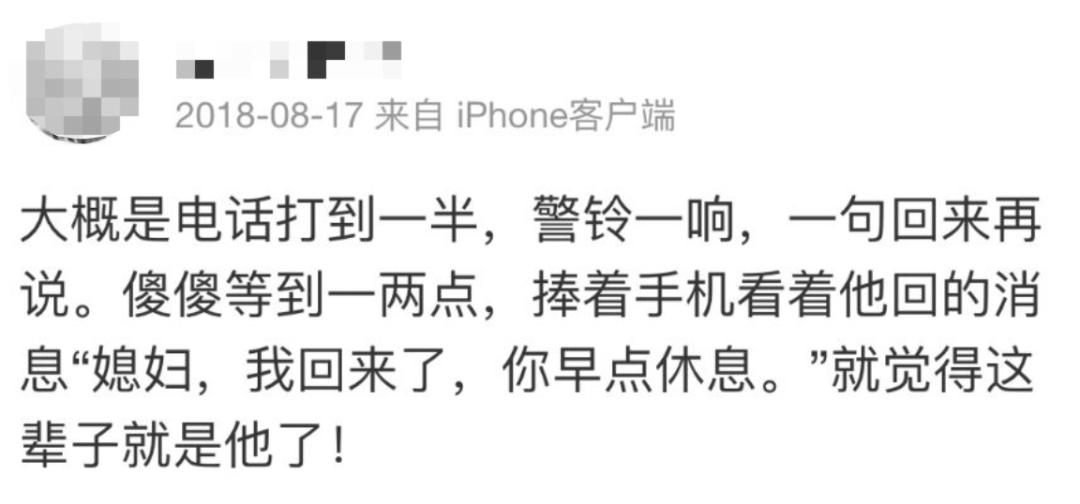 “大概是电话打到一半,警铃一响,一句回来再说。傻傻等到一两点,捧着手机看着他回的消息‘媳妇,我回来了,你早点休息。’就觉得,这辈子就是他了!”