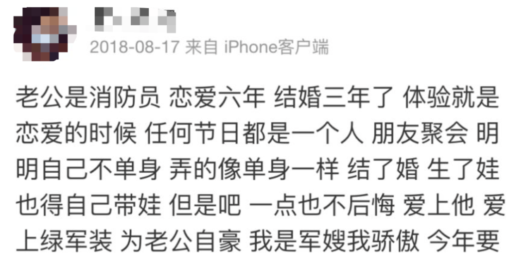 “老公是消防员,恋爱六年,结婚三年了。体验就是恋爱的时候,任何节日都是一个人,朋友聚会明明自己不单身,弄的像单身一样,结了婚、生了娃也得自己带娃。但是吧,一点也不后悔。”