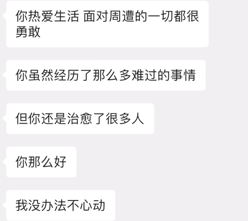 “你热爱生活,面对周遭的一切都很勇敢。你虽然经历了那么多难过的事情,但你还是治愈了很多人。”