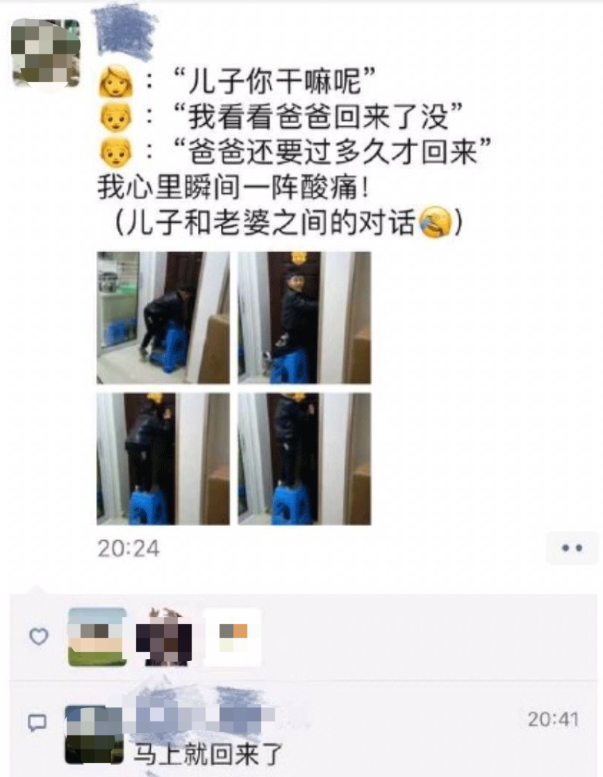 浙江的一位消防员在朋友圈发了“妻子与儿子的对话”,照片上小男孩踩着板凳,趴在门上,看着外面。