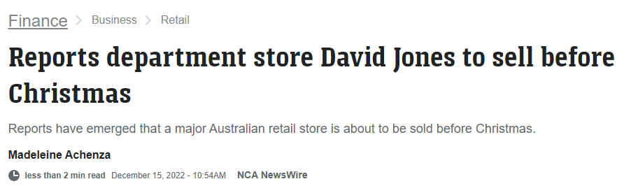 根据《澳洲金融评论报》的报道,澳洲百货公司巨头David Jones很大可能即将在圣诞节前完成出售。
