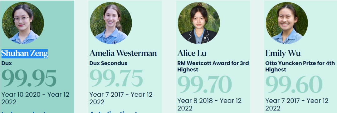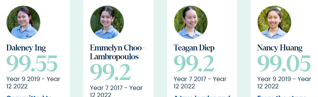 Angela 完美的 ATAR 是她成熟和积极主动的学习方式和参与学校生活的直接结果。Angela在担任学校联合队长的过程中大放异彩,以其平易近人和包容的天性出色地领导了学校。今年,她也被耶鲁青年全球学者计划录取。
