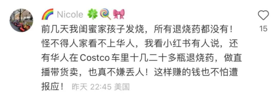 不得不说,代购这种大规模抢空的行为实在让人无语,有网友说:“前几天我闺蜜家孩子发烧,所有退烧药都没有…还有华人做直播带货卖,也真不嫌丢人,这样赚的钱也不怕遭报应。”