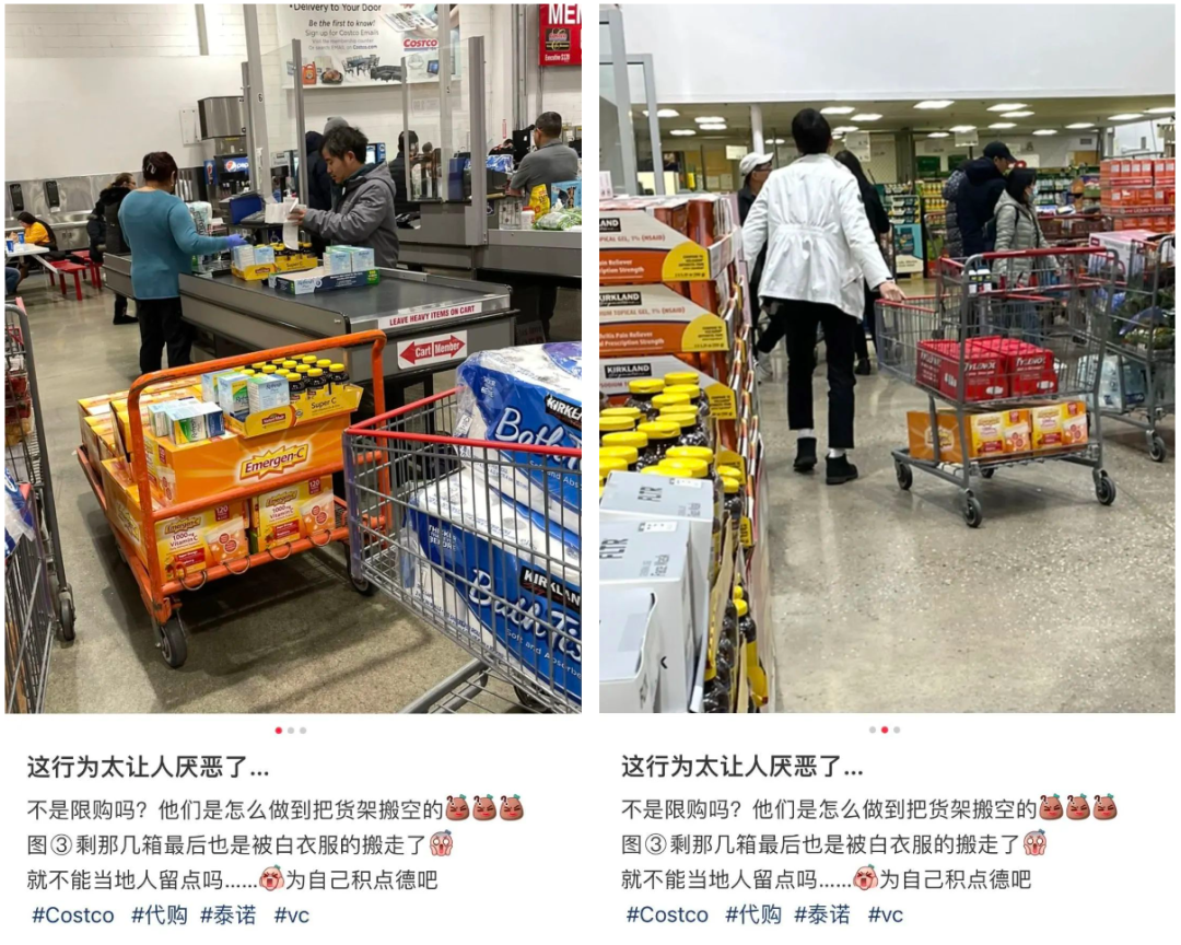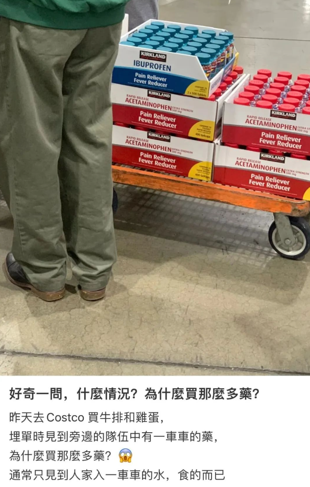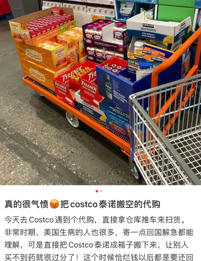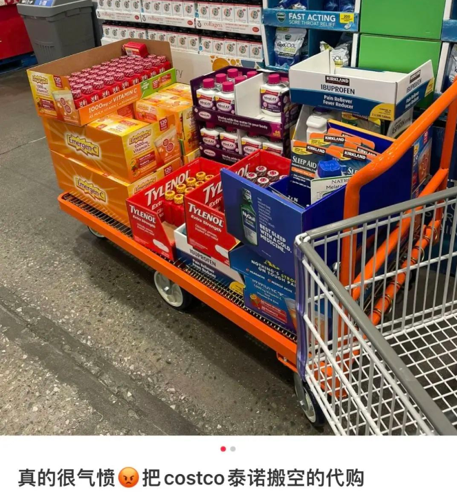 代购们更是早早就下场,狂囤各种退烧药、维生素C等等,网友爆料称有的代购甚至直接到Costco,上小车把泰诺全部搬空。