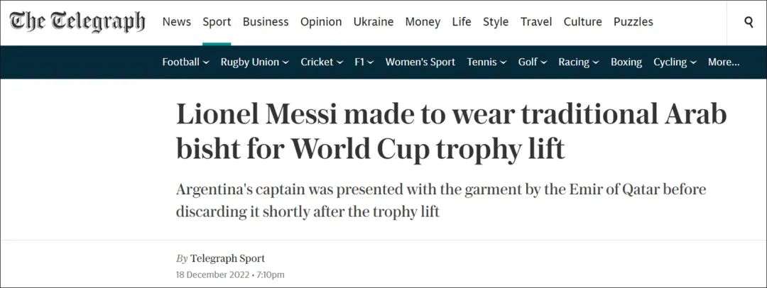 其他西方媒体也对此提出了更多批评,英国《每日电讯报》最初用了个标题,“破坏世界杯历史上最伟大时刻的奇怪行为”,以指梅西穿着这件比什特。后来,该媒体又将新闻标题改为“梅西在举起世界杯奖杯时被要求穿上传统的阿拉伯长袍”。英国《镜报》也是如此,该媒体的头条称梅西“被迫遮住阿根廷队的球衣”。