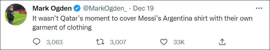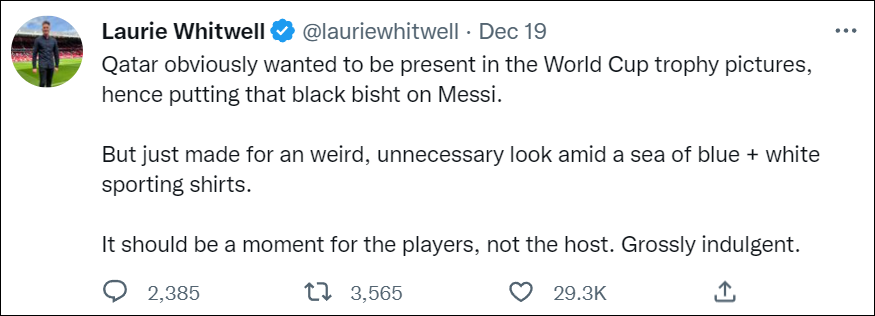 另外,在一条后来被删除的推文中,美国体育媒体ESPN英国站记者马克·奥格登(Mark Ogden)甚至轻蔑地将这件比什特描述为“一件让他(梅西)看起来像是要去理发的斗篷”。在另一条推文中,奥格登还继续指责卡塔尔,称“这不是卡塔尔用他们自己的衣服盖住梅西阿根廷球衣的时刻”。
