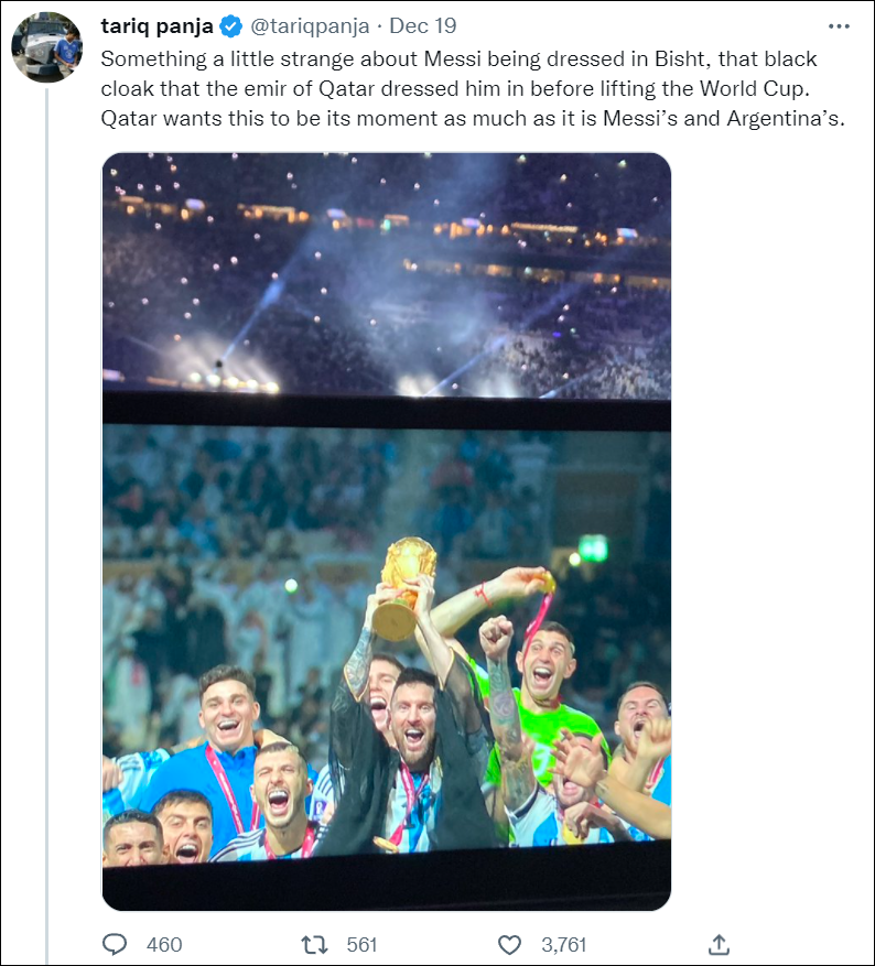 美国《纽约时报》记者塔里克·潘贾(Tariq Panja)也批评卡塔尔喧宾夺主,毁了梅西的专属庆祝时刻。潘贾在推特上写道:“梅西穿着比什特有点奇怪,就是那件卡塔尔埃米尔在梅西举起世界杯奖杯前给他穿的黑色斗篷。与这是属于梅西和阿根廷的时刻一样,卡塔尔也希望这是属于自己的时刻。”