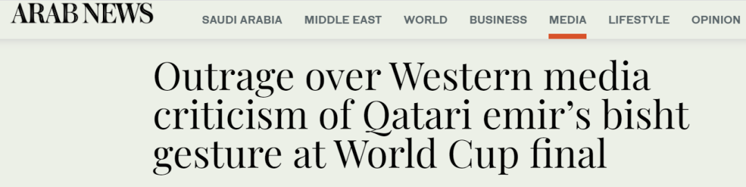 沙特的阿拉伯新闻网注意到这一情况,网站于19日报道称西方媒体批评卡塔尔埃米尔给梅西穿上比什特,并对此表示“不屑”(disdain)。就此,阿拉伯新闻网指出,穿着这种服装是一些阿拉伯国家的传统,作为一种态度,反映了对重要和有影响力的人物的高度尊重和高度荣誉。