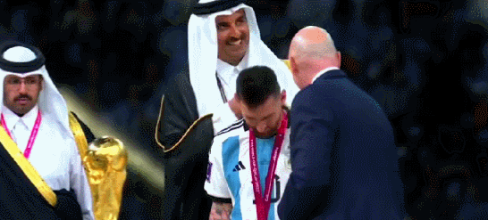 当时,梅西首先与国际足联主席詹尼·因凡蒂诺和卡塔尔埃米尔塔米姆握手。随后,塔米姆给梅西穿上了一件金边黑色薄纱外袍,然后穿着这件阿拉伯传统服装比什特的梅西接过大力神杯,将奖杯举过头顶。