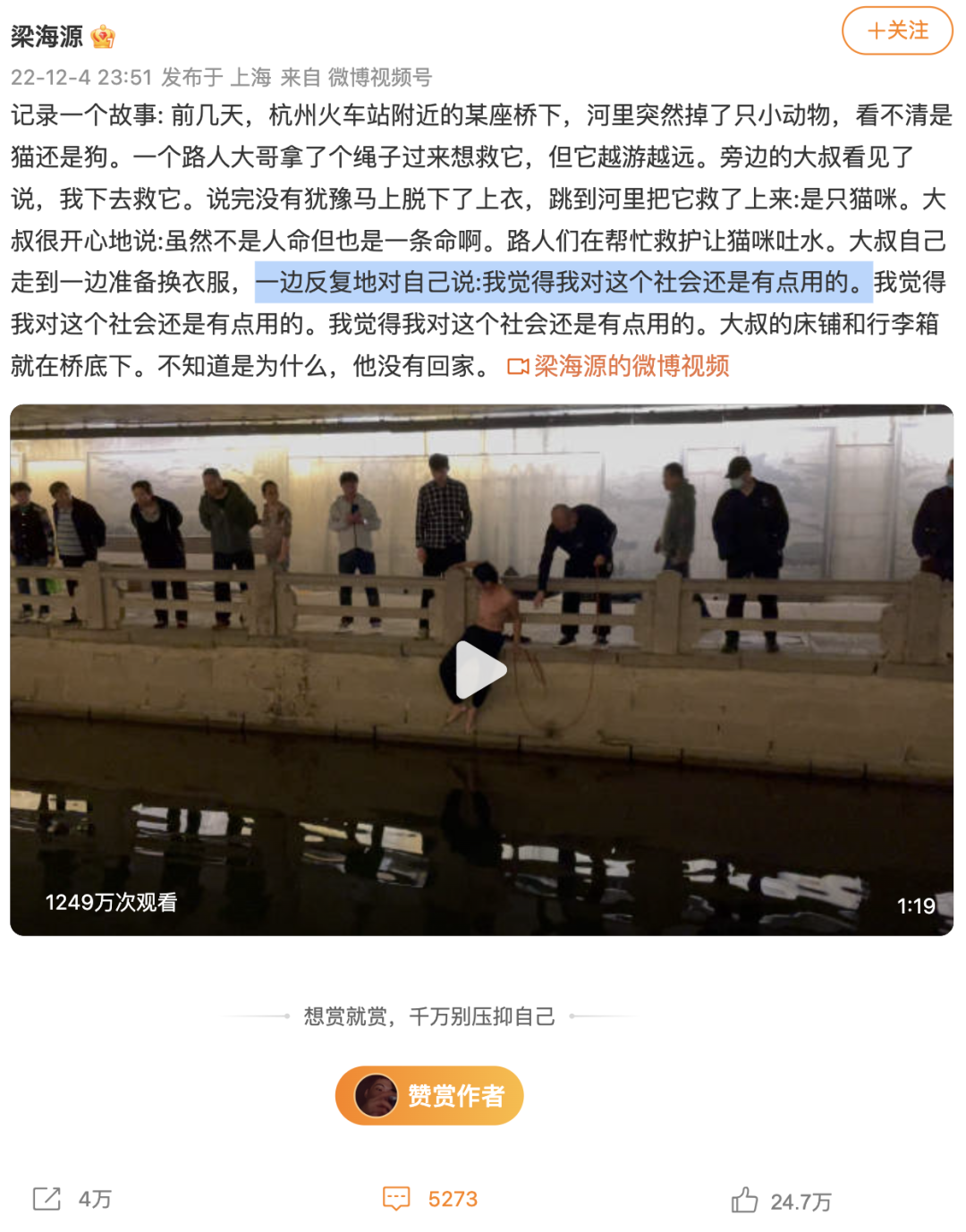 梁海源在杭州火车站附近的某座桥旁,看到一个路人大叔跳进河里救一只小猫。