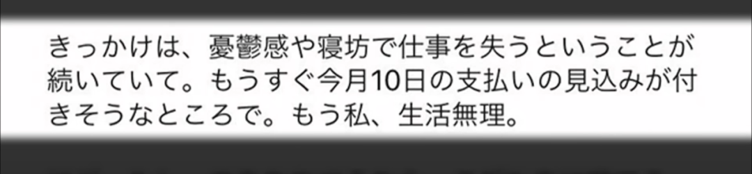 “撑不下去了······最近得了忧郁症,也天天失眠,工作也没了。这个月马上就到10号了,每个月的付款日······不行,我已经没办法了······”