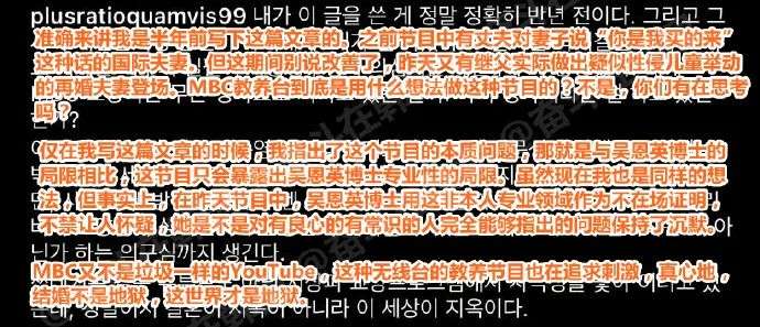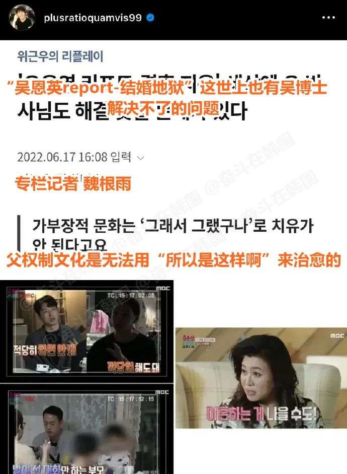 在此次争议中,希望不是只有吴恩英博士、节目制作组和MBC反思自己的过错思,最重要的是当事者——那位丈夫的行为应该受到警方调查。