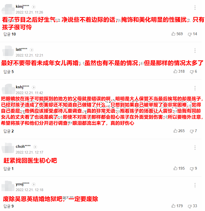 韩国观众批评吴恩英博士道:“本来很喜欢吴博士的,现在太失望了”、“吴博士一直出现在各种节目中作为医生、专家给大家提供建议,但是对于这样的事情她却看不出来吗”、“她好像已经失去了作为医生的本心,看到这种场面应该向警方举报的”……