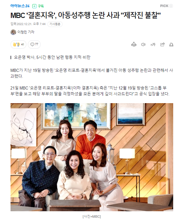 21日下午,MBC《结婚地狱》终于发表了公开道歉文。