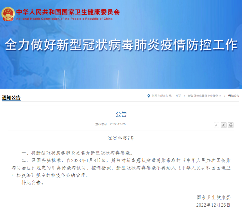 2022年12月26日晚,中华人民共和国卫生健康委员会宣布: