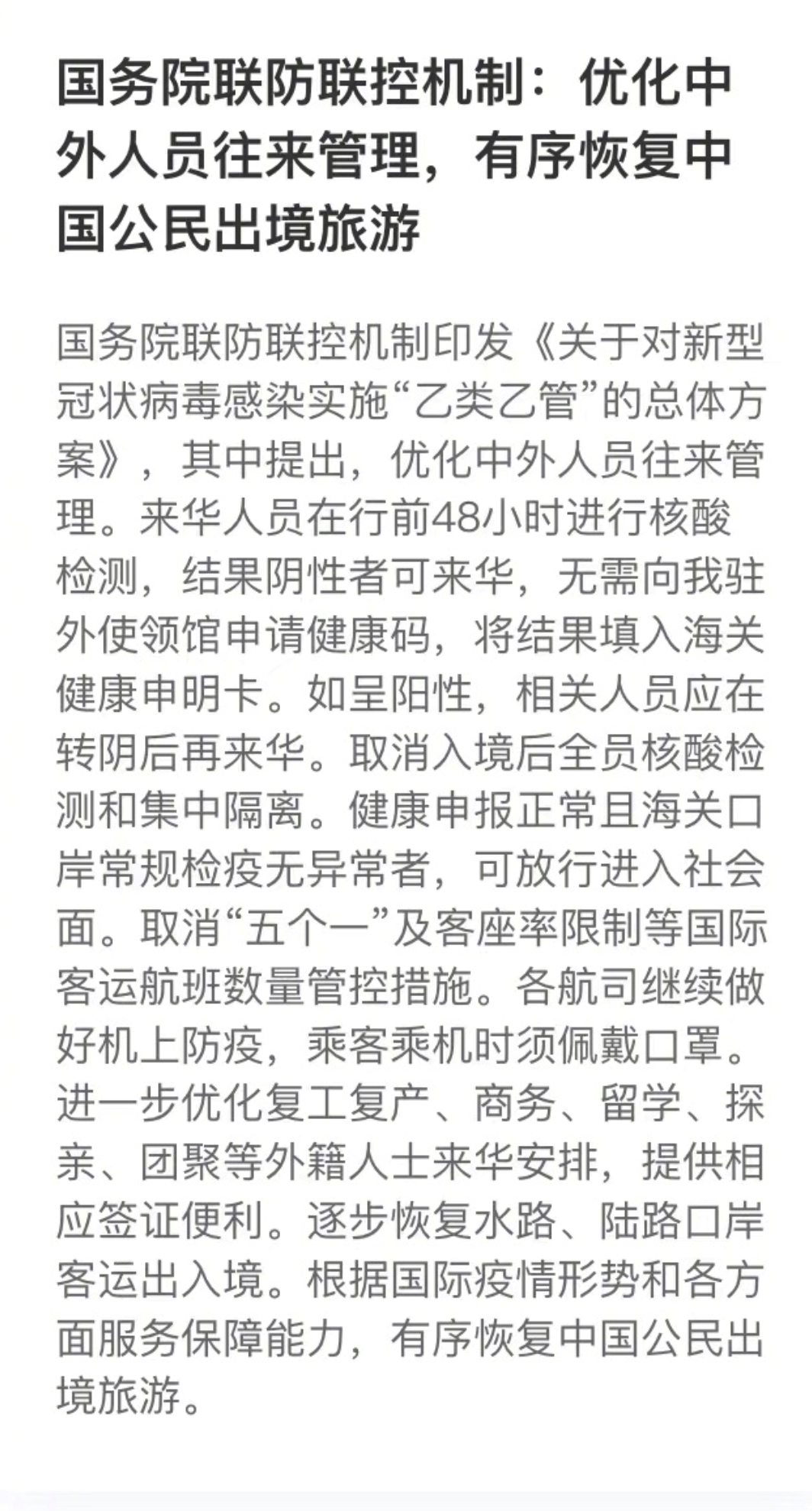 其中明确将废除入境隔离政策、废除“五个一”及国际航班数量限制,同时宣布将开放出境游!