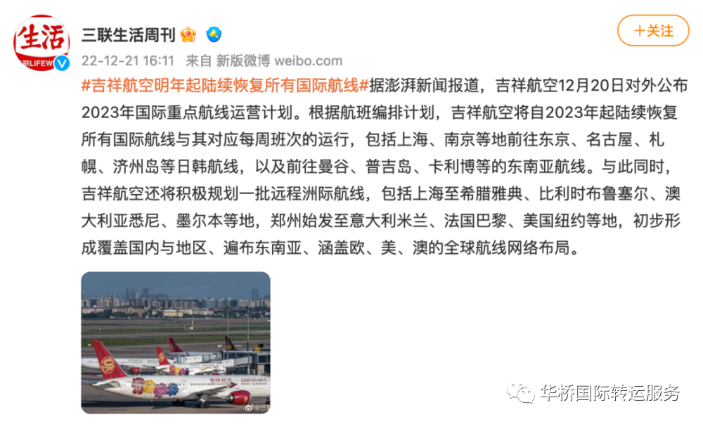 此次吉祥航空的官宣,也意味着中国将逐步恢复国际航班。
