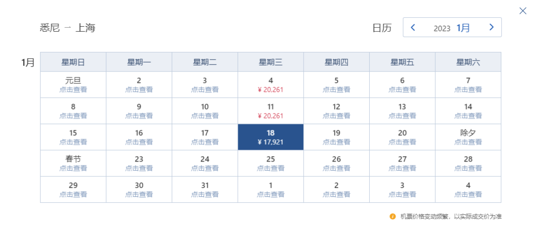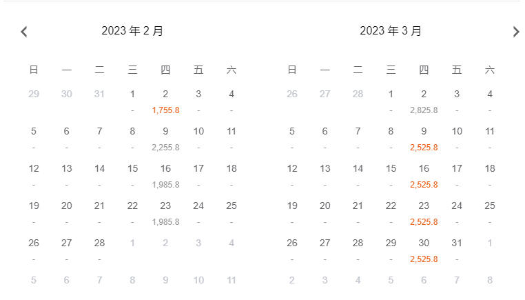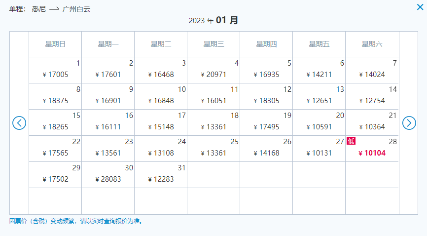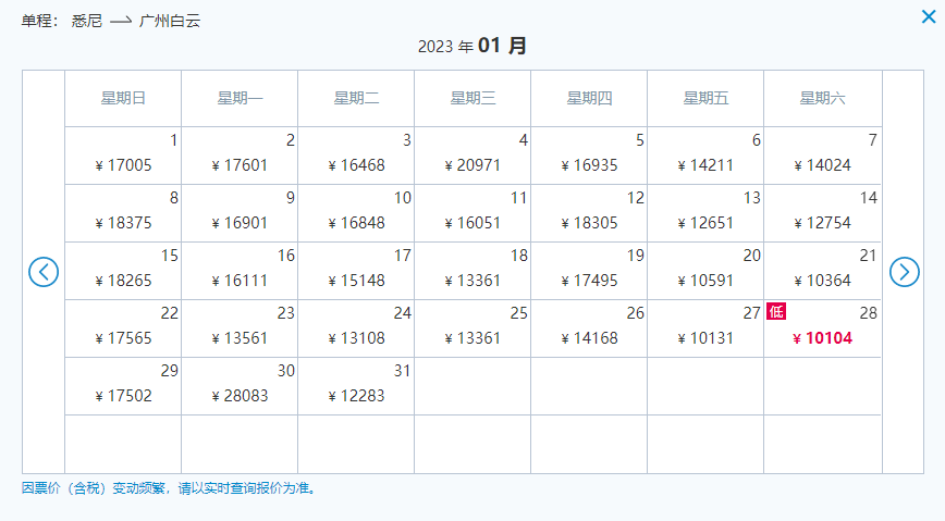 从1月和2月航班价格来看,不管是直飞还是中转机票价格都不超2万人民币,多数票价都在1.5万人民币以内,而最低可以买到10104人民币的机票。