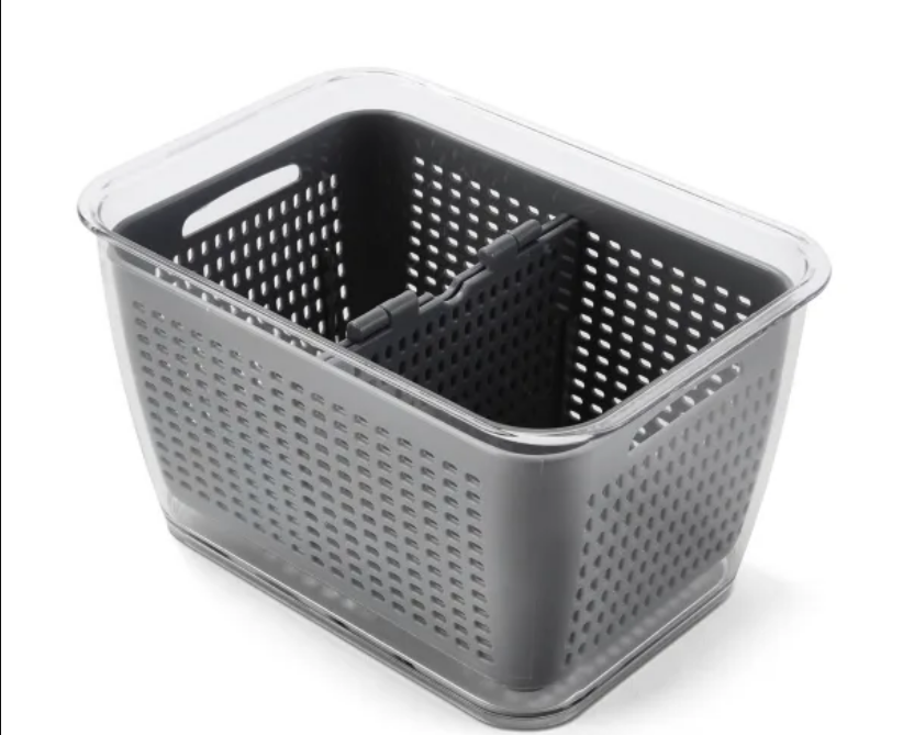 把切好的菜放在沥水保鲜盒里,水会直接漏下去,食物就可以保持新鲜,随取随用,干净又美观。