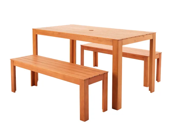 这套餐桌椅包括一张桌子和两个长凳子,桉木材质,十分结实稳当。适合放在后院,平时坐下来喝茶聊天晒太阳,非常方便。