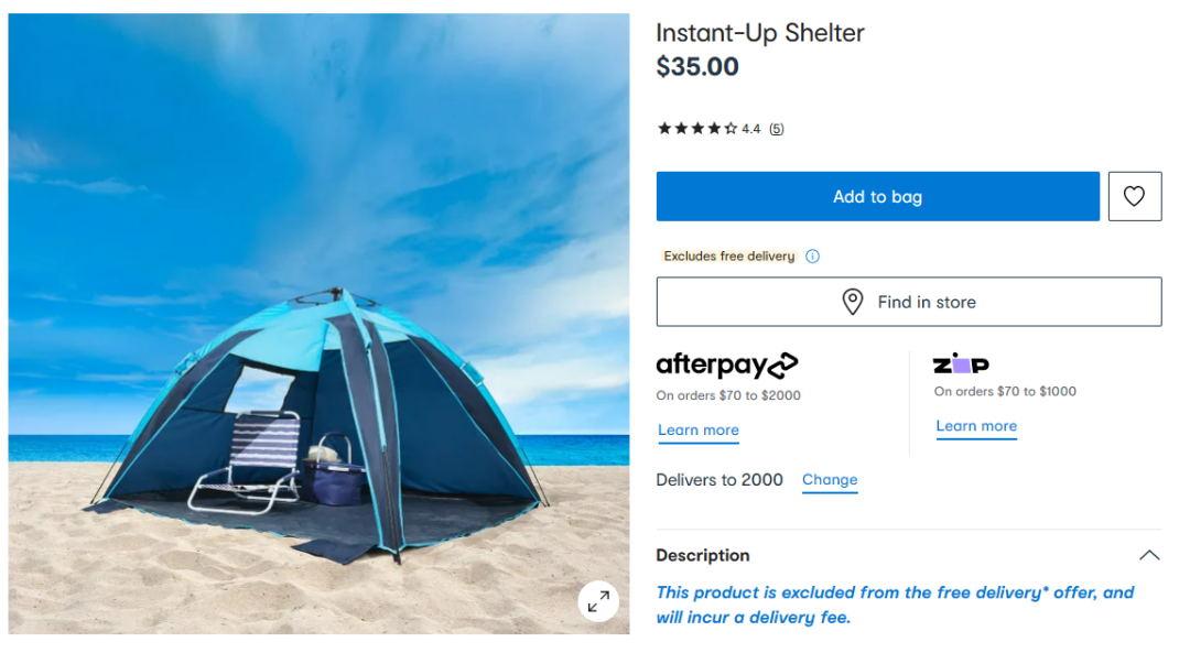 这款帐篷为海军蓝颜色,搭建后的尺寸为:130cm(高)x 200cm(宽)x 200cm(深)防晒效果也不错,UPF50+面料阻隔98%有害紫外线。有钢钉和沙袋可以保护帐篷。